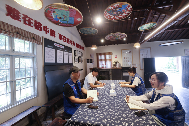 6月18日,在嘉兴市秀洲区王店镇庆丰村网格议事站内,网格长、网格员们召开网格议事会,讨论村里目前碰到的新情况。新华社记者 徐昱 摄